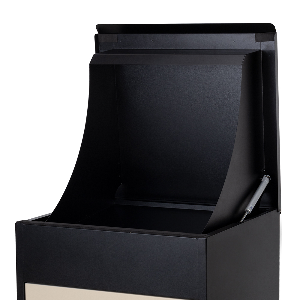 | Besonderheit | Dieser Paketkasten mit großem Fassungsvermögen ist mit einem von oben zu öffnenden Zustellschlitz und einer vorderen Zugangstür ausgestattet, so dass Kuriere Pakete von oben abgeben können, während Benutzer die Lieferungen bequem von vorne herausholen können. |