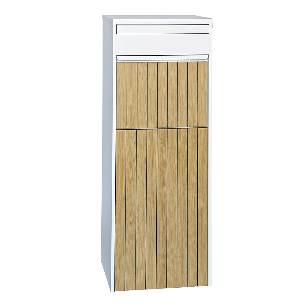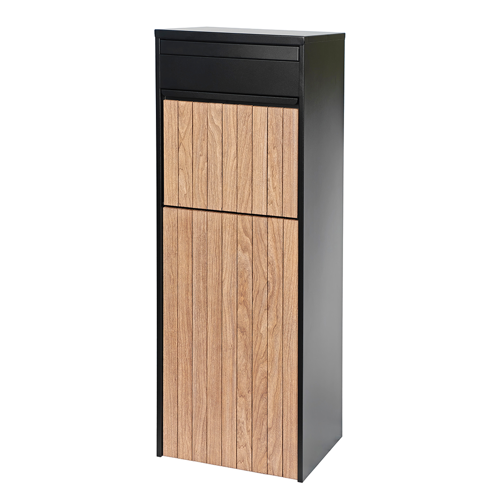 | Besonderheit | Dekorative vertikale Metallstreifen verleihen der Frontplatte Tiefe und optische Schichtung, sodass sich der Paketkasten für moderne Wohnprojekte eignet. |